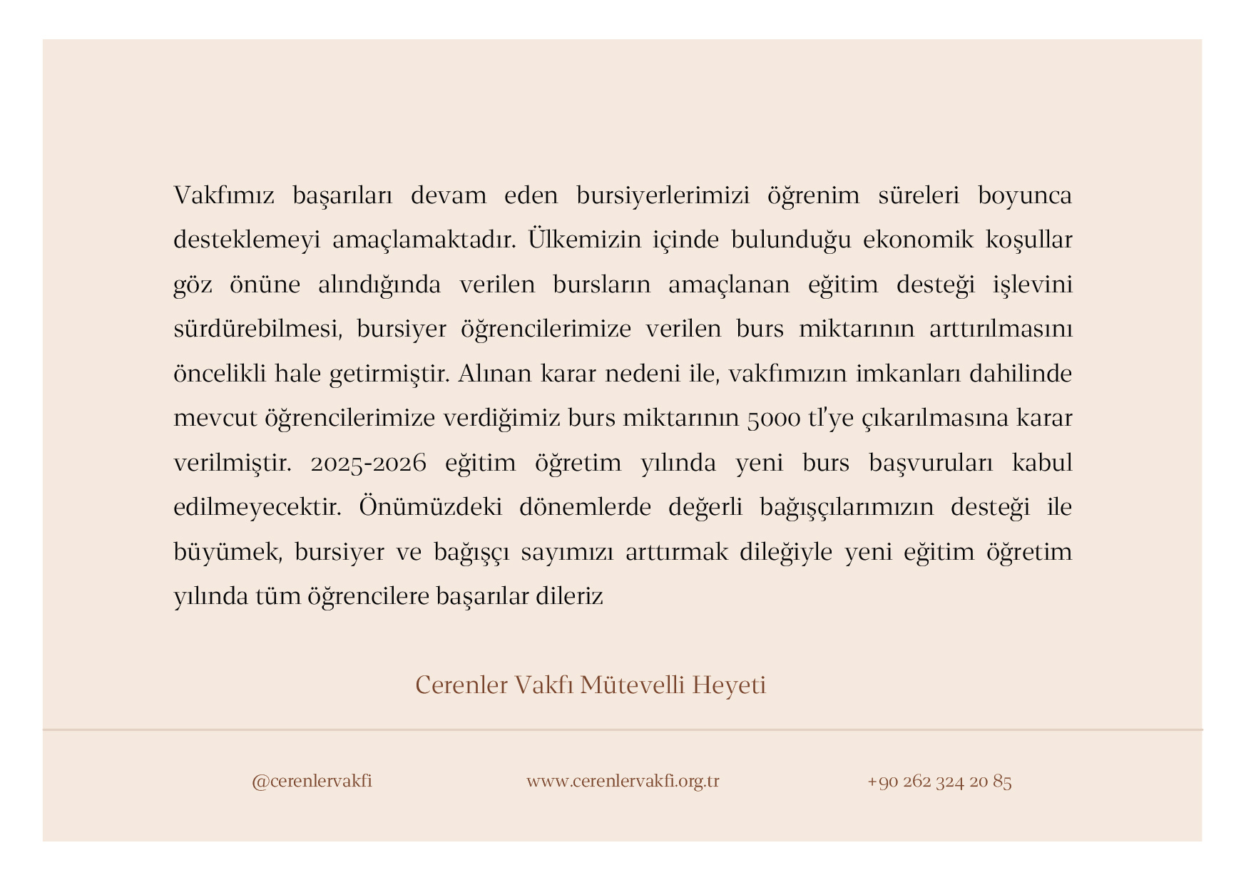 Verdiğimiz burslar karşılıksızdır. Burs alan öğrencilerimizin vakfa dönük bugün ya da ileride herhangi bir maddi yükümlülüğü söz konusu değildir.